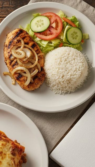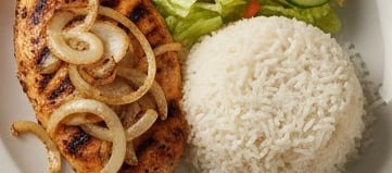 Pollo encebollado: Sabor casero, con un arroz insuperable y ensalada.